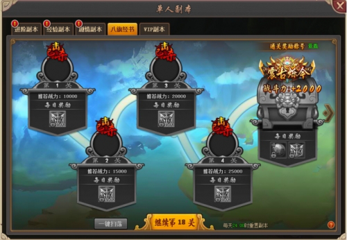 四、玩家已经通关的关卡,可以在隔天进行扫荡,并拿到100%的副本奖励,无需玩家浪费时间再打一次。
